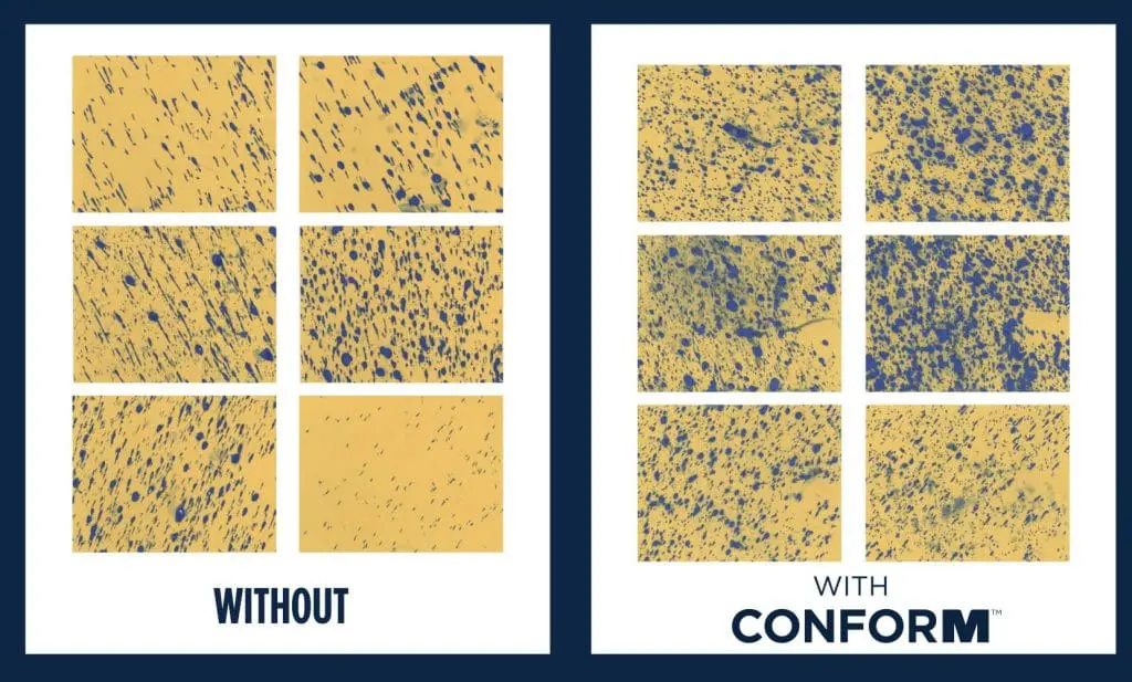 Conform helps to maintain a more uniform spray pattern, but does not negatively affect spray patterns at higher rates, pressures, or longer run times in the tank like the older polymer-based drift aids can.