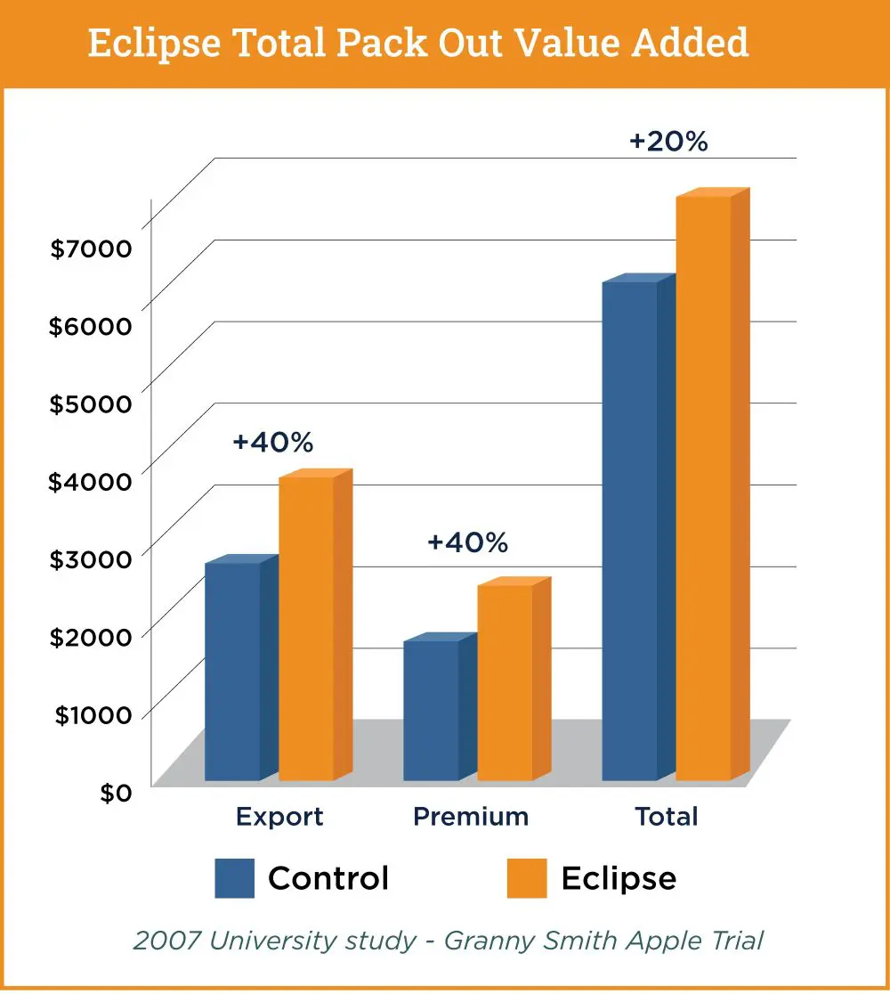 - Eclipse improves water retention during periods of heat stress, protecting the fruit and reducing the need for additional irrigation. This allows the plant to redirect its energy toward uniform fruit sizing, color, and firmness – resulting in higher pack-out rates and better marketable yield.