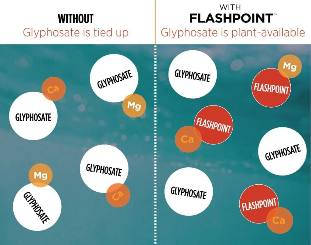 Flashpoint binds to hard water minerals leaving glyphosate plant-available and outperforms the leading herbicide activation products.
